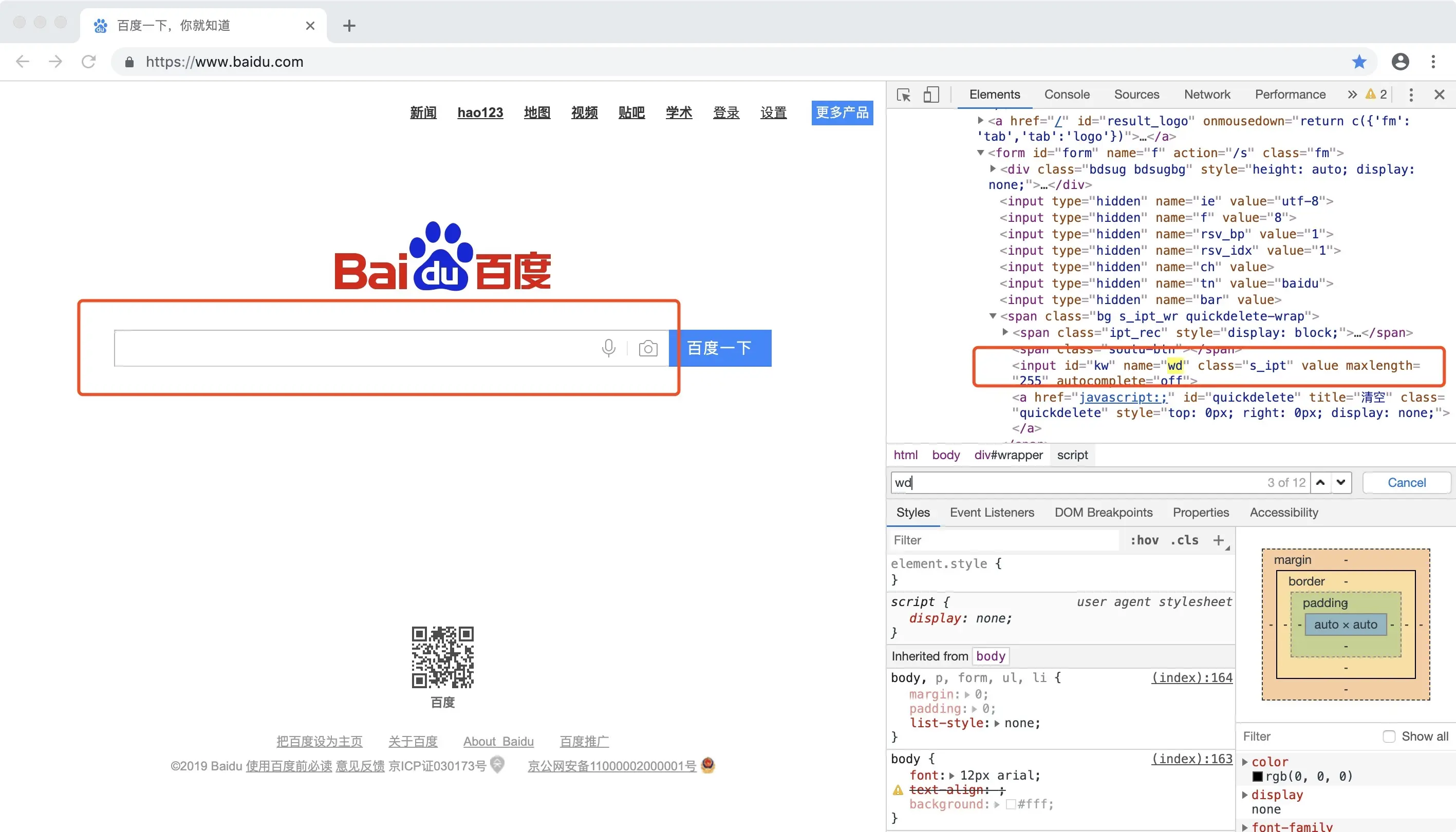 这里说一个简单的,就是获取百度搜索栏的name(上面代码中的wd) 打开百度网页,右键--检查,会看到右侧弹出html的代码。