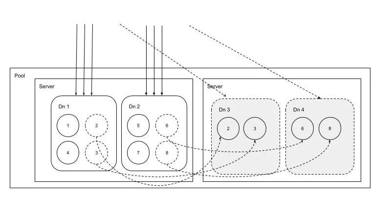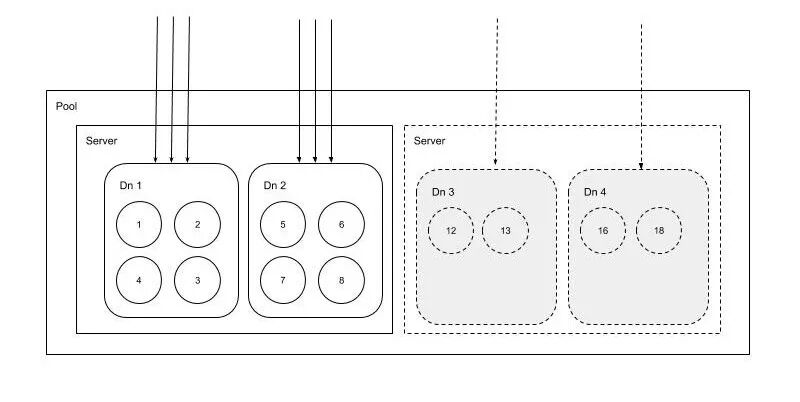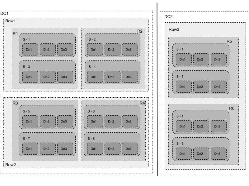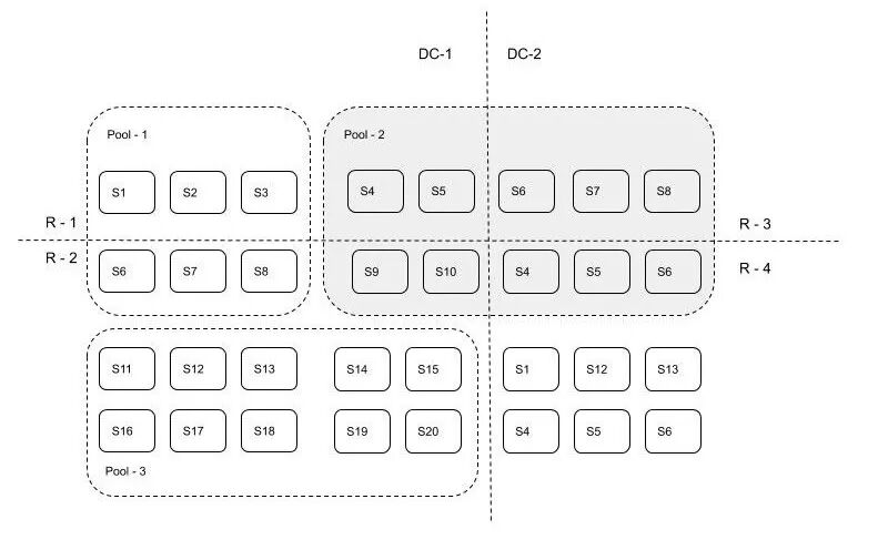S代表服务器,R-1, R-2是属于数据中心DC-1的两个机柜,R-3, R42是属于数据中心DC-2的两个机柜。Pool-1是跨机柜故障域的资源隔离池,Pool-2是跨数据中心故障域的资源池,Pool-3是跨服务器故障域的资源池。