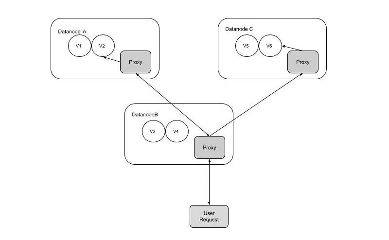 我们知道,Datanode具有数据存储的功能,可是对于数量众多的Datanode来说,用户要想知道哪些数据存储在哪个Datanode上是需要先从Master 拿到数据路由的元数据才知道,这增加了用户请求的复杂度。我们在Datanode上增加了请求代理、路由模块把用户的请求自动代理、路由到正确的Datanode上,使得用户一次请求既能获取数据。