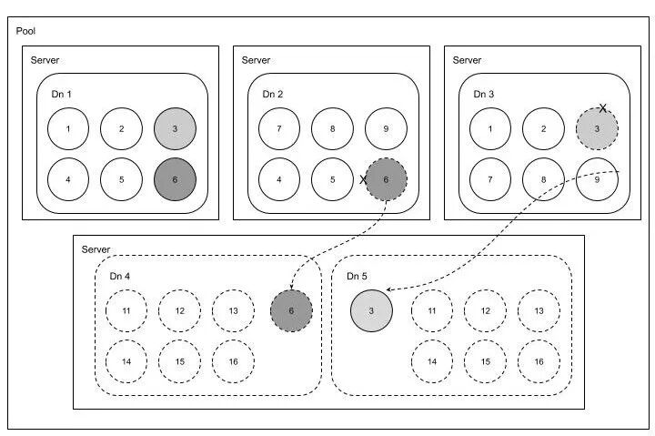 由于硬盘故障,数据节点 2 和 3 上的Volume 3 和 6 副本丢失,自动补齐自动把这两个副本补齐到数据节点 4 和 5 上,并加入到集群中。