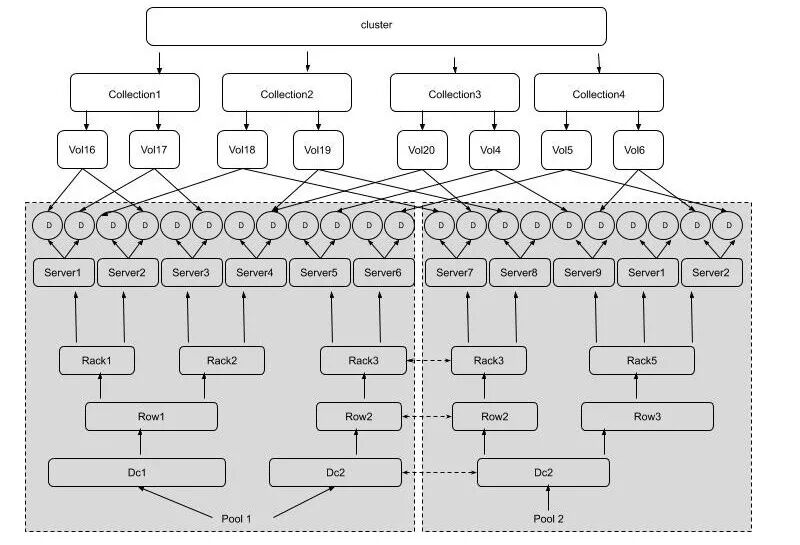 其中上半部分是逻辑概念,下半部分是物理概念。用户及请求均与逻辑概念相关,管理运维涉及物理概念相关。一个用户可以对应一个或者多个Collection, 一个Collection对应多个Volume, 每个Volume是存储在DataNode上的文件(有几个副本就有几个文件)。一般一个DataNode对应服务器上的一块硬盘。一台服务器上有多个DataNode。服务器(Server)的上层是机柜(Rack)、一排机柜(Row)和数据中心(DataCenter)。