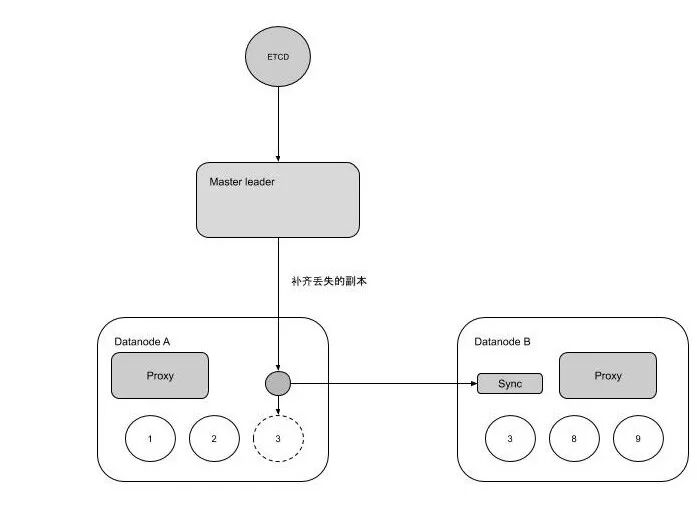 一定规模的集群故障可能会变的比较频繁,在我们的系统中故障很大程度上意味着数据副本的丢失,人工补齐数据副本工作量较大,因此自动化补齐副本就成了一个比较重要的功能。自动化补齐副本是靠Master发现副本缺失和协调补齐的。在补齐的过程中数据副本都会变成只读。过程如下图: