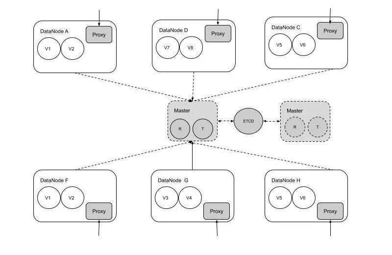 其中,Master负责集群的元数据存储、集群管理、任务调度等工作,它的数据一致性目前由外部一致性工具(ETCD等)实现。Master是一个主多个备。