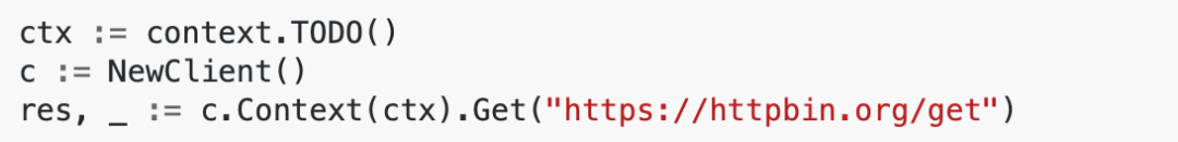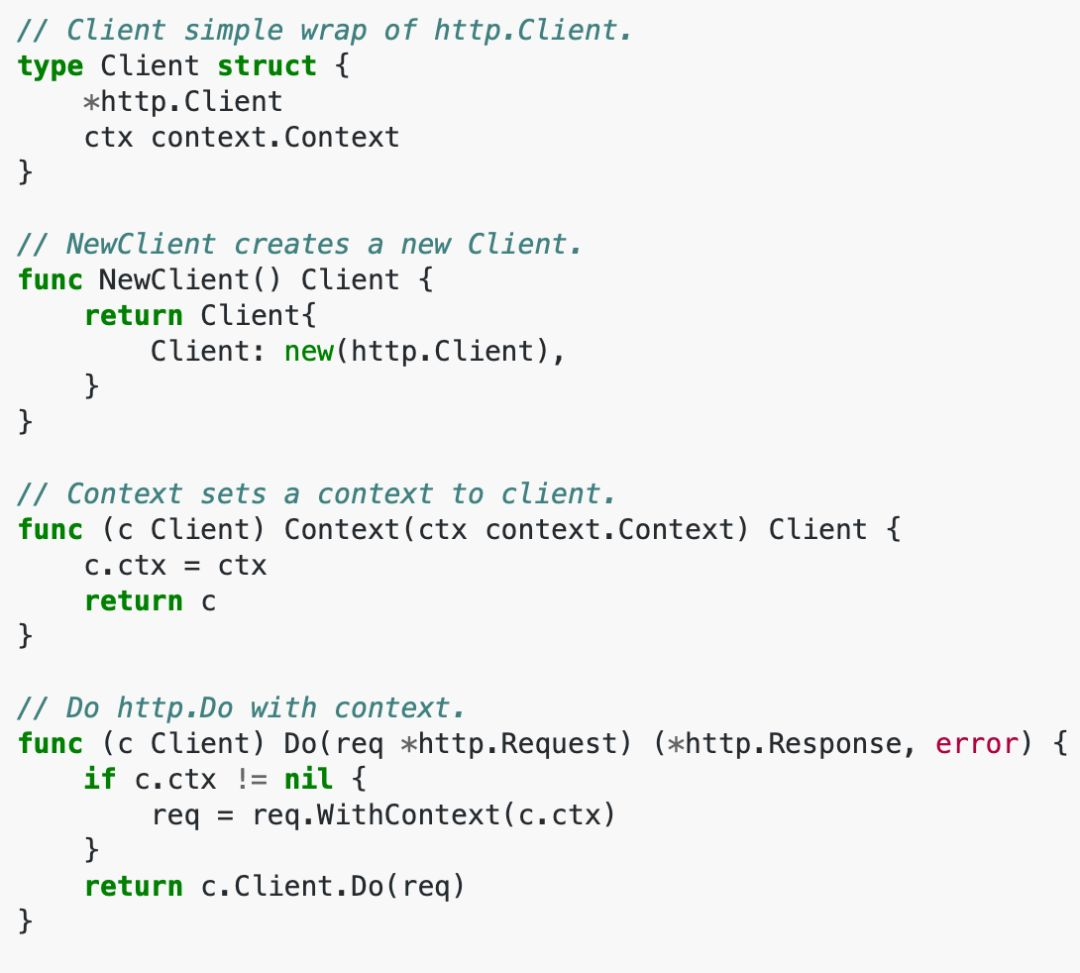 这个片断企图改写 http 包 Client 结构的方法以达到传递 context 的效果。因发起 HTTP 请求的各大方法都通过调用 Do 方法来执行请求,常规思维下,只需新声明一个结构继承 Client 然后重写 Do 方法就行了。