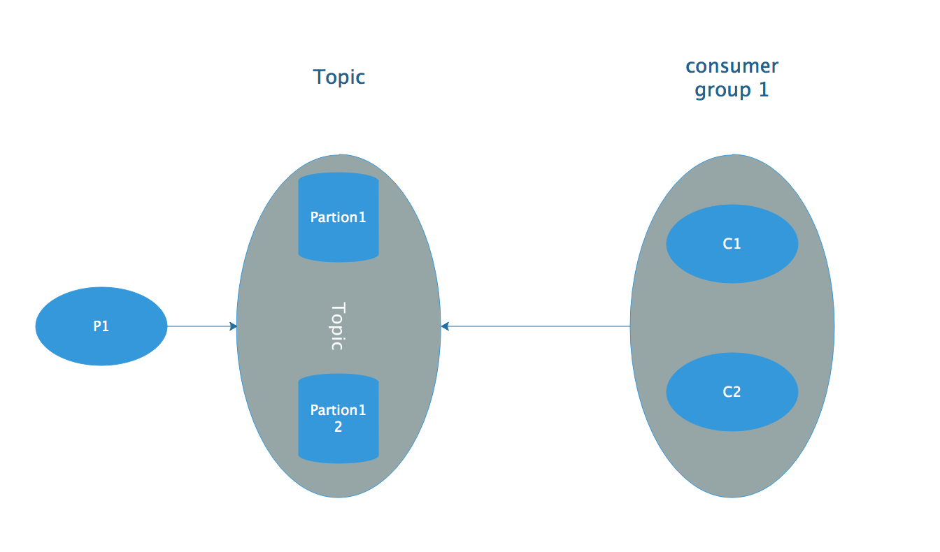 gourp1 监听一个topic, c1和c2会分别消费一个分区。
