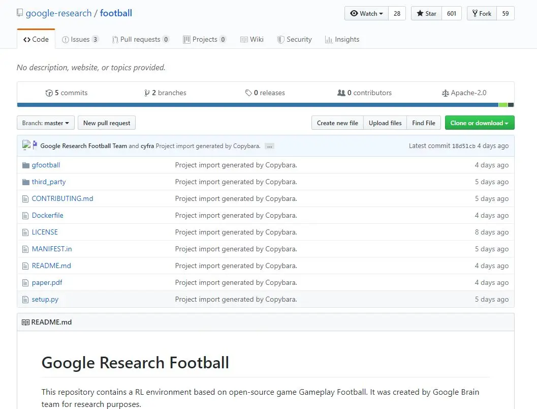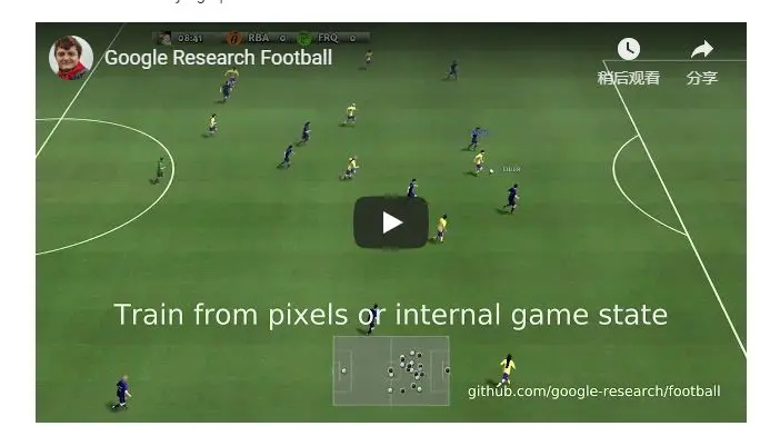 Google大脑在GitHub上开源了足球人工智慧研究专案Google Research Football,这是一个研究增强学习的环境,目标是让人工智慧代理掌握足球这项运动,能让代理人控制游戏中的足球运动员,学习互相传球,或是进行防守等足球技巧。