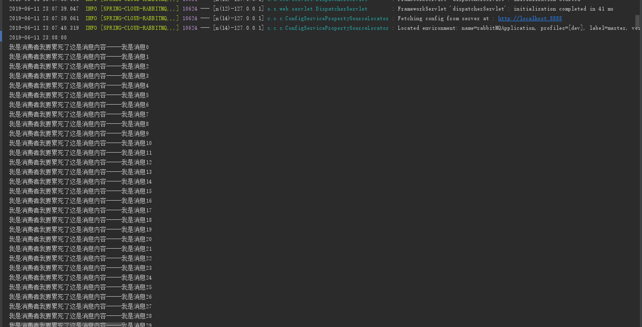 System.out.println("我是消费者我要累死了这是消息内容-----"+message);