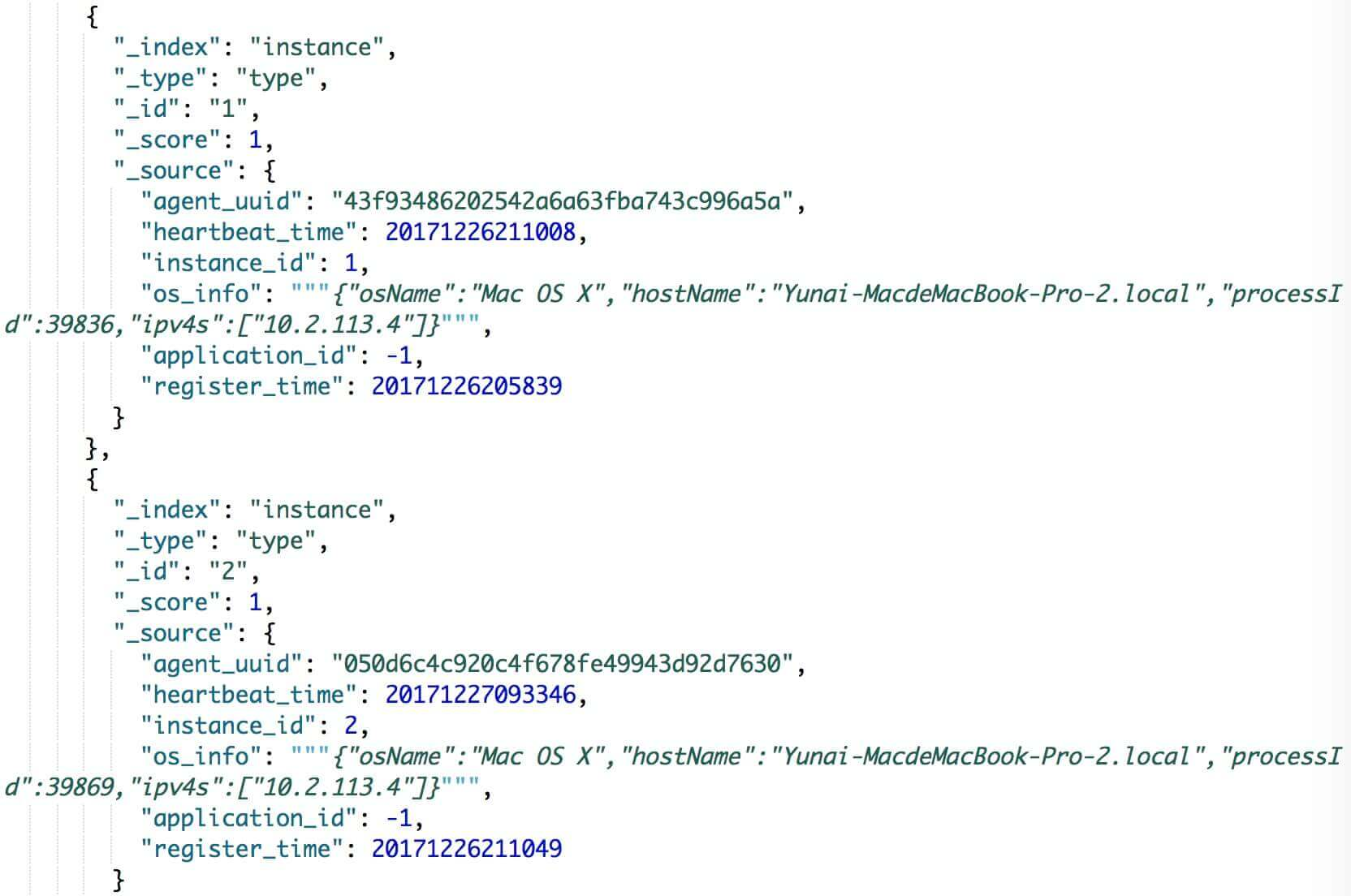 org.skywalking.apm.collector.storage.table.register.Instance ,应用实例。例如记录在 ES 如下图: