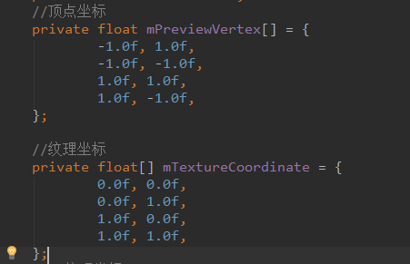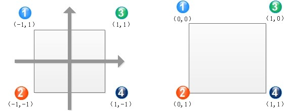 顶点的坐标数据如上面截图所示,这两组数据该这样理解,首先确定4个图形顶点的坐标(第一组数据),这是一个正方形,其坐标系为openGL坐标系,以中心点为原点,见下左图;第二组数据右边的一个坐标系是纹理坐标系,已左上角为原点(android中应该做了转换,原本的opengl中是以左下角为原点的)。
