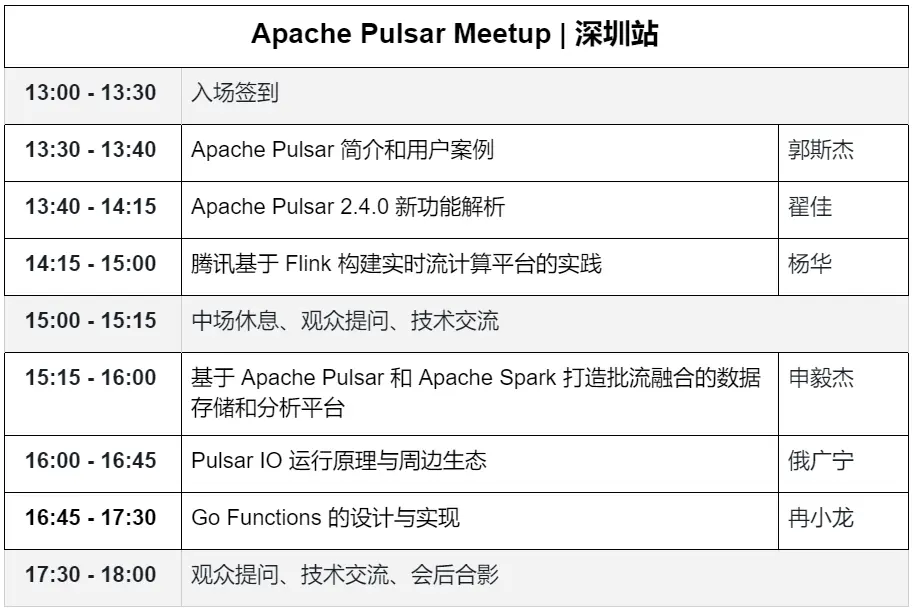 - 2018 年 12 月 上海 Meetup:介绍了如何使用 Apache Pulsar 打造实时数据 Pipeline、解构 Apache Pulsar 强大的生态组件 Functions/IO、Schema 与 Pulsar SQL 等。