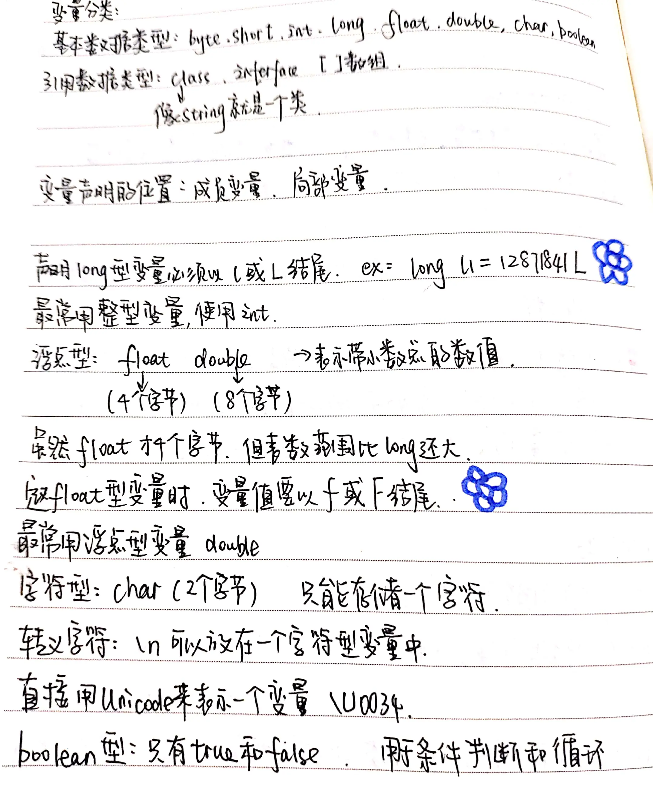 2.基本变量类型分为整形,浮点型,字符型。整形包括byte (2个字节) short (4个字节) int (8个字节) long (),浮点型包括float(),double()