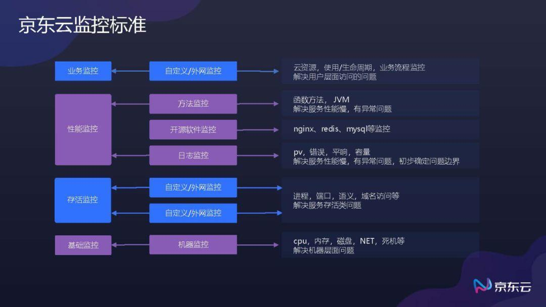 监控还需要解决发现问题以后的定位,和定位后的止损,从而降低故障MTTR,即故障平均恢复时间。像京东这样的大体量电商,如果发生不明原因的宕机所导致的损失是十分惨重的。为了高效解决降低故障恢复时间的问题,在故障发生之前提前做好相应故障的恢复预案;在故障发生之后明确故障类型并且准确定位故障,是非常有效的手段。