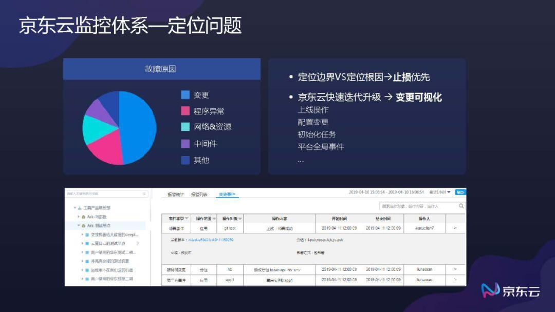 谈及如何定位问题,郑永宽总结道,首先监控可视化是关键一环,多维度的聚合计算使数据更有意义,这是基于京东云多年的运维经验总结得到的。京东云的监控体系可以定位多种故障原因,例如某一业务是否有变更,是否配有相应的报警,网络等资源是否异常,是哪个业务出现的问题等……通过以上方面的监控,我们可以知道某一业务的故障恢复操作的执行情况,此方式对故障快速定位以及查找故障来源非常有效。基于以上确认故障原因的能力,京东云快速迭代升级开发了变更可视化产品,对可能导致故障发生的所有问题来源进行事件监控,从上线操作、配置变更的单任务监控到平台全局事件的监控,进一步助力京东云监控体系定位问题能力的提升。