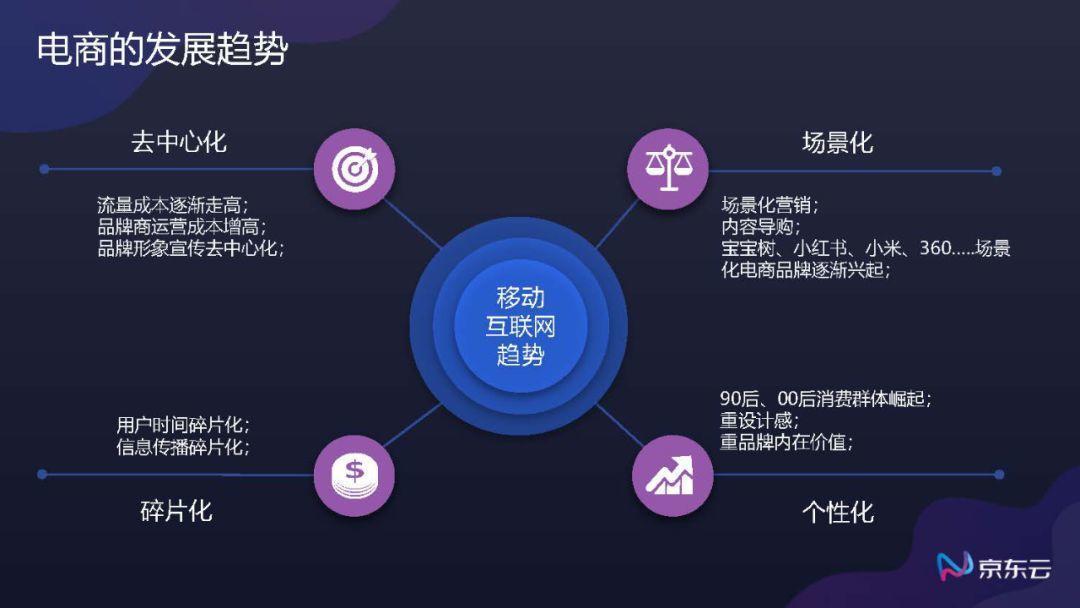 从整个电商发展来看可以被总结为”四化“,分别是去中心化、场景化、碎片化以及个性化。我们发现流量成本越来越高,“带领着”获客成本、品牌商运营成本也一路居高不下,这恐怕就是品牌商自己不做运营选择其他途径的原因,正所谓“品牌形象宣传去中心化” 就是这个道理。