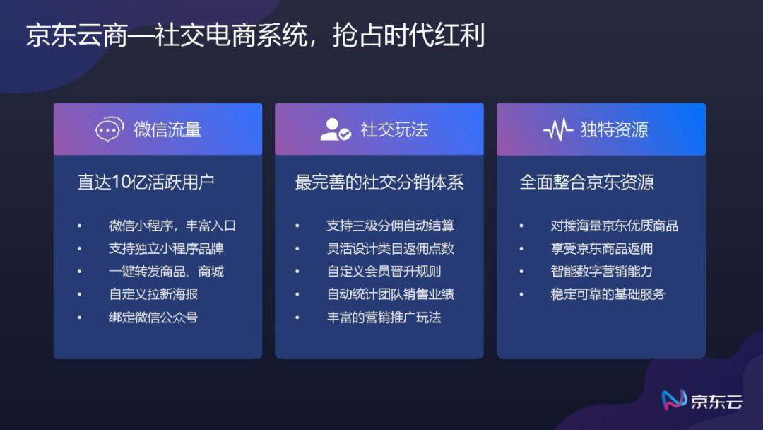 所谓社交电商,必然与”社交”关系密切,进而社交工具自然必不可少。除了凭借五花八门的推送工具,京东云社交电商还凭借京东与生俱来的海量商品以及优势供应链屡获成绩。基于京东大数据营销的能力,海量用户的精准画像以及商品推销、智能选品等这些稳定可靠的基础服务来打造系统。