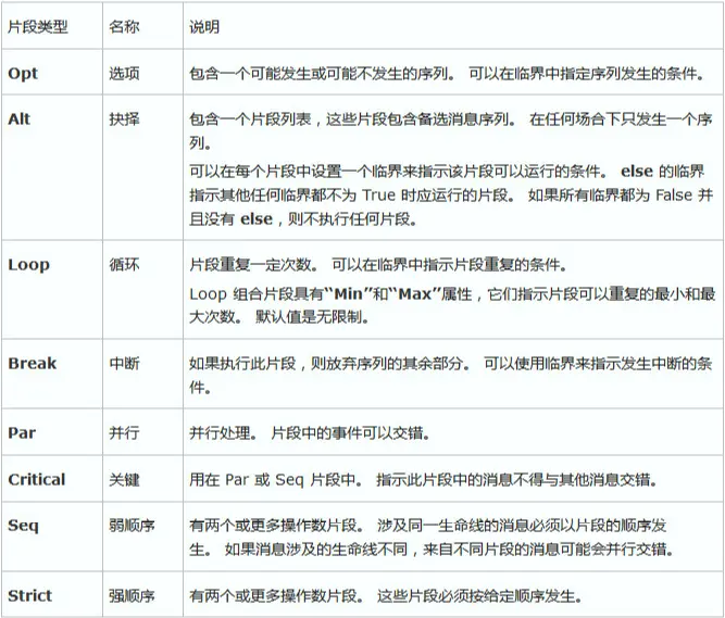 组合片段用来解决交互执行的条件和方式,它允许在序列图中直接表示逻辑组件,用于通过指定条件或子进程的应用区域,为任何生命线的任何部分定义特殊条件和子进程。组合片段共有13种,名称及含义如下: