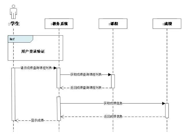 接下来,我们按照上面所讲的时序图的绘制步骤,以学生在教务系统中查询其课程的成绩为例,来讲解时序图的绘制方法。