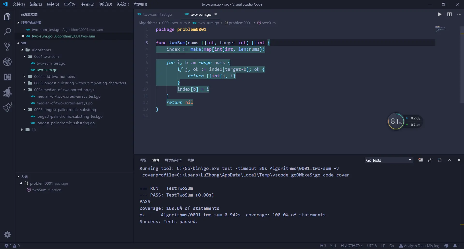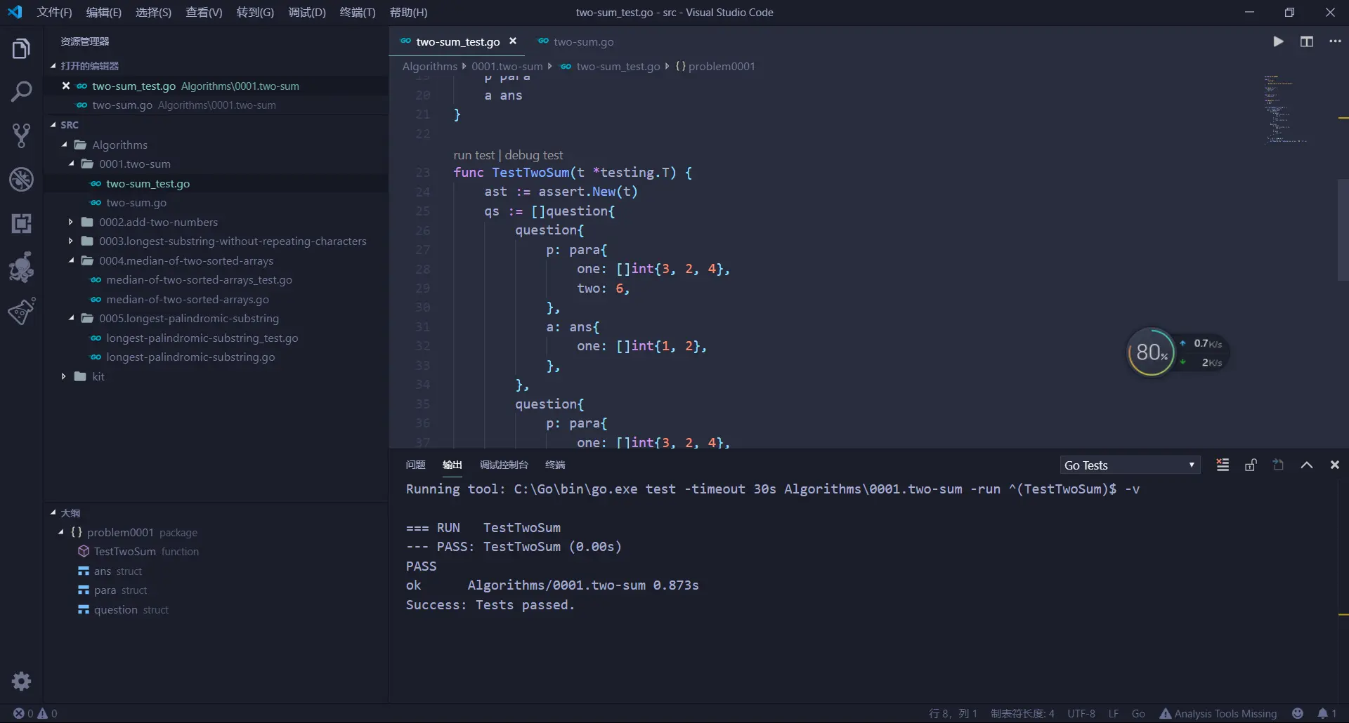 以two-sum为例,第一个输入参数是int数组,第二个输入参数是int,输出结果是int数组。在Go中定义如下结构对应本题的输入、输出数据。