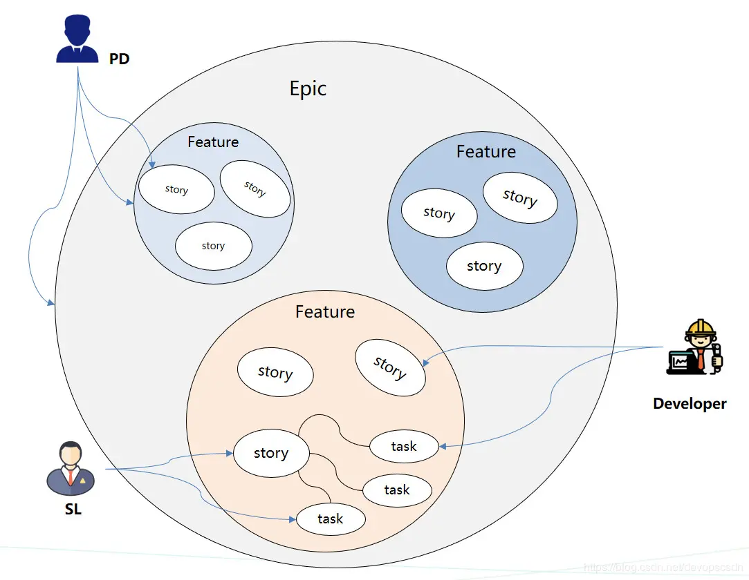 2.研发流程模式上,我们采用scrum,固定每周一个迭代,每个迭代会发布多个版本。为了打磨我们的产品,我们所有的工作都使用DevCloud ProjectMan上来管理,用业界时髦的实践就是“吃狗粮”。产品经理会将需求按照Epic-Feature-Story的层级整理好,然后通过迭代会议制定迭代计划,大概的流程图如下: