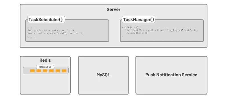 从图中可以看到,我们有两个服务在服务器上运行。TaskScheduler将创建一个新任务,将其添加到数据库,然后将任务的ID推到任务队列的末尾。TaskManager等待任务添加到队列后适当地处理它。