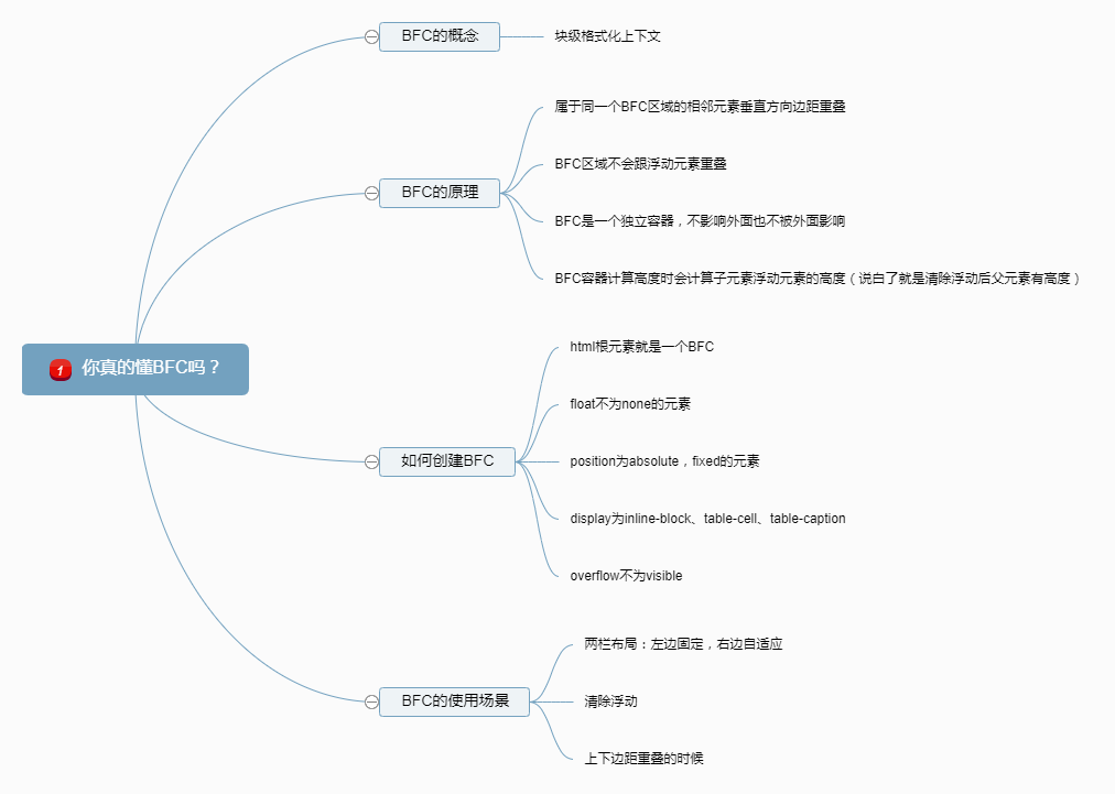 怎么回答当面试官问你什么是BFC 喵大仙不吃辣 2019-06-12 2,504 阅读1分钟 概述:相信大家平时在工作的时候经常会写BFC,但是当面试官问你什么是BFC的时候,你该怎么回答呢?一个好的回答应该包含哪些?问题一:BFC的概念?问题二:BFC的原理?问题三:如何创建BFC?问题四:BFC的使用场景?如果上面四个问题,你都能回答出来,那么说明你已经非常熟悉了BFC的,下面内容可以忽略,若你犹豫不决答不上来,那么请看下面我通过思维导图把问题跟答案画出来,这样大家能清晰点