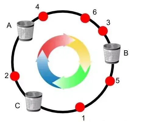 如上图所示,假设每个桶 当前上限 是 2,红色的小球按序号访问,当编号为 6 的红色小球到达时,发现顺时针首先遇到的 B(3,4),C(1,5)都已经 达到上限,因此最终放置在桶 A 里。