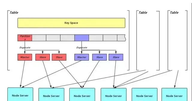 上图是 分布式KV存储 Zeppelin中的 分片方式,Key Space 通过 Hash 到 分片,分片及其副本 又通过一层映射到 最终的存储节点 Node Server。