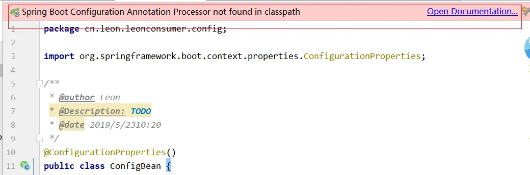 在配置类中添加@ConfigurationProperties注解后会出现提示信息。
