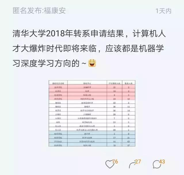 一网友发帖爆料称:清华大学2018年转系申请结果,看到这份名单,感觉计算机人才爆炸时代即将来临。