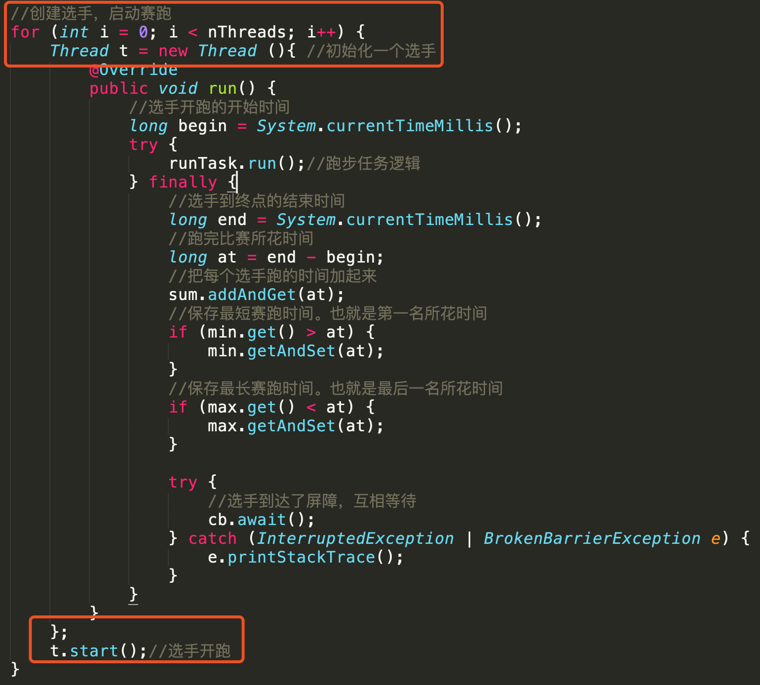 选手是通过for循环创建出来的,而且创新好后,就执行start开跑了。这个是不对的。