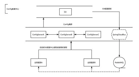 另外,需要说明的是,默认情况下,如果 Git 中的配置更新了,Config Client 不会进行更新配置,我们目前的解决方式是,使用 Spring Cloud Bus 进行动态刷新配置(Config Server 中配置),具体的流程: