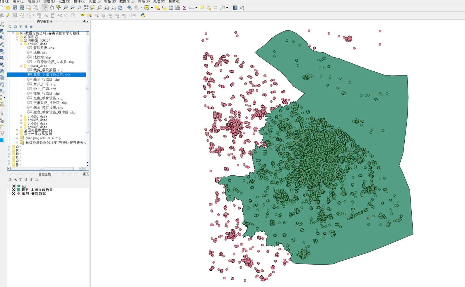 我们以上海市餐饮店铺地址分布为例子,细节可具体分为(以下的合并、交集、融合、差分、交集取反步骤都类似,下面将不再重复陈述):