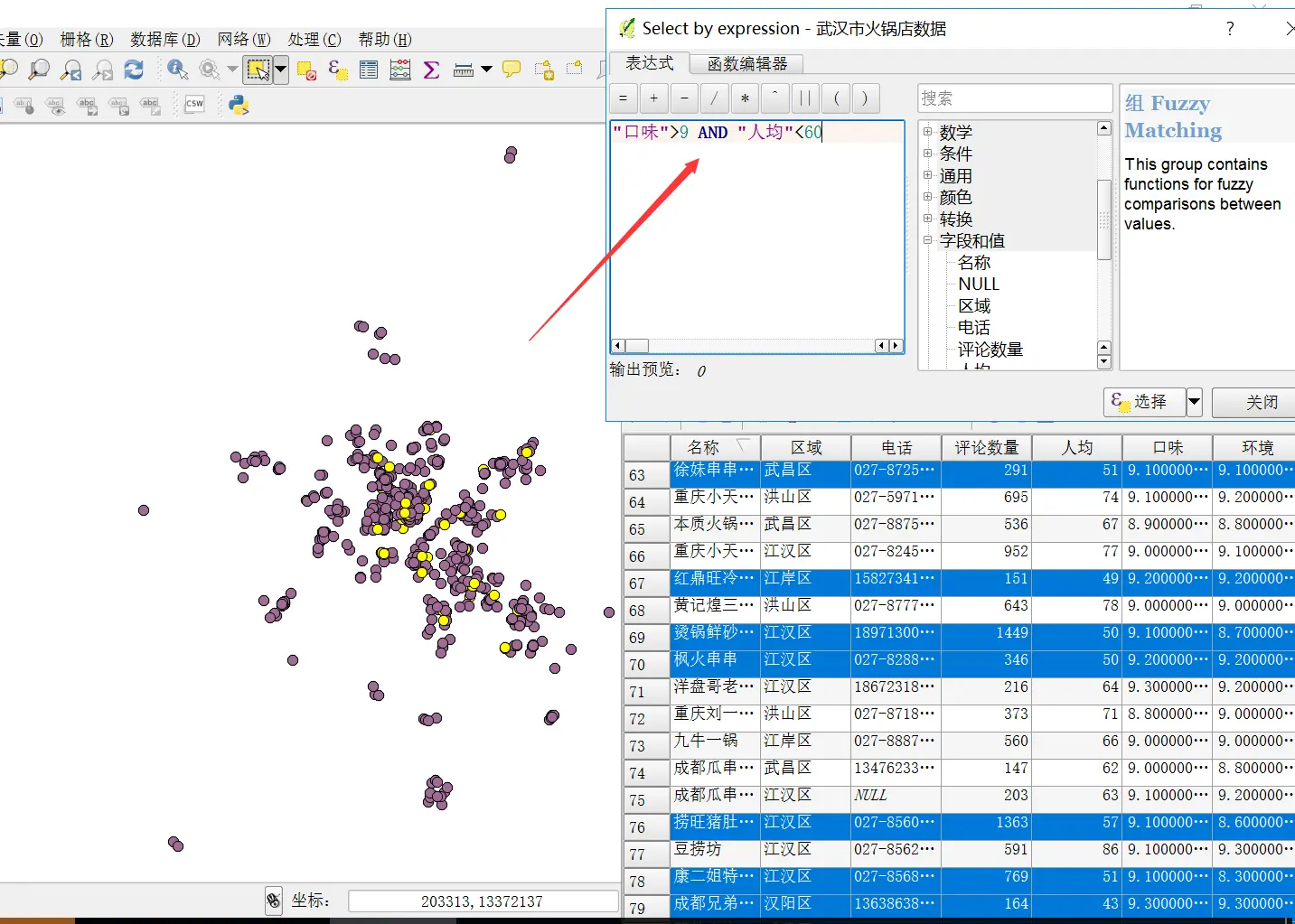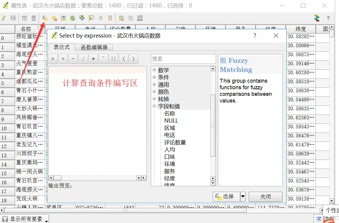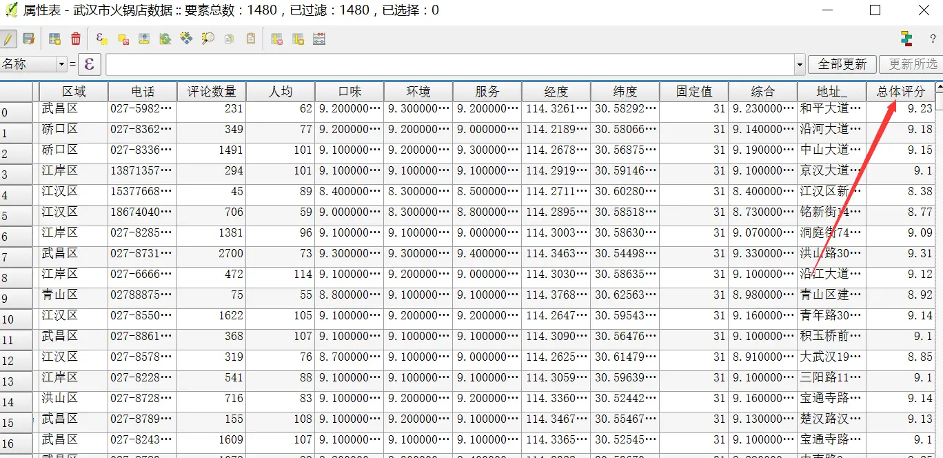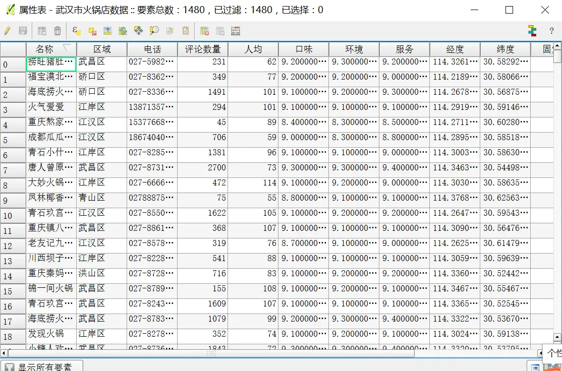 空间数据属性选择其实就是QGIS里数据属性表里数据的选择,以武汉市火锅店的一张空间数据表为例展开:
