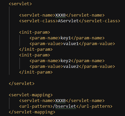 主要实现是管理容器传给servlet一些信息。初始化参数与servletContext,serverlet标签在配置文件中的写法如下图:name是唯一标识,class代表真是的servlet类。里面包含一些initparameter配置信息。