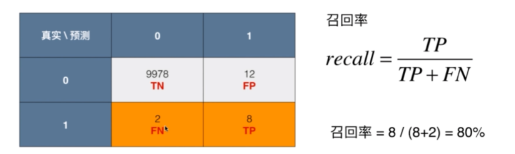 癌症系统:真实患癌症的人中,我们预测成功了80%。真实有10个人患癌症的人,我们召回了8个人。 金融系统:实际股票上涨的10只股票,我们预测对了8只,即召回了8只。