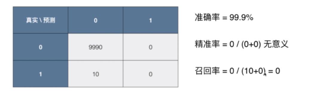 结论:当数据极度倾斜的情况下,准确率来衡量是不准确的。