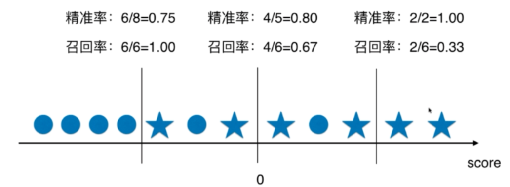 举例说明:其中五角星实际分类为1,圆圈实际分类为0,对于决策边界的不同,对应的精准率与召回率也不相同。