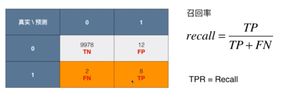 表示:我们关注的那个事件,真实的发生了的这些数据中,我们成功预测了多少。