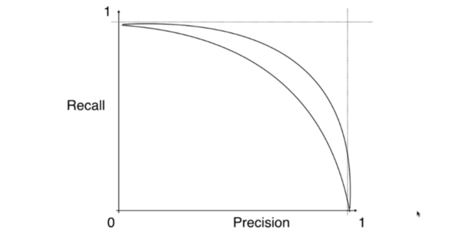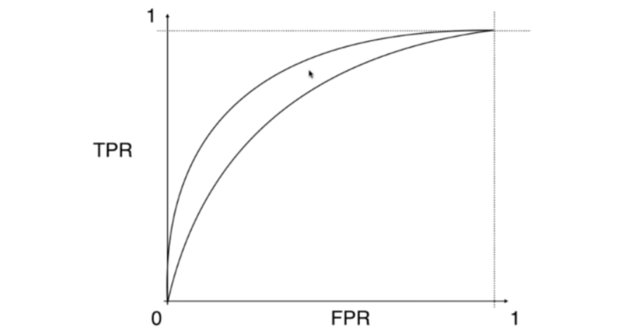 那么如果我们通过两次调参,分别获得如下的曲线,那么说明外侧曲线的模型更好一些,也可以通过面积来看,不过通常会使用下面ROC曲线的面积,来衡量我们的算法。