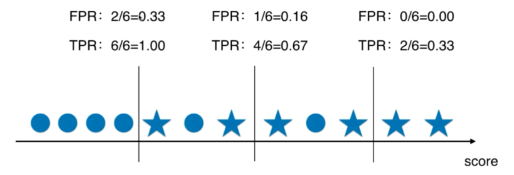 举例说明:其中五角星为真实分类为1,圆圈真实分类为0