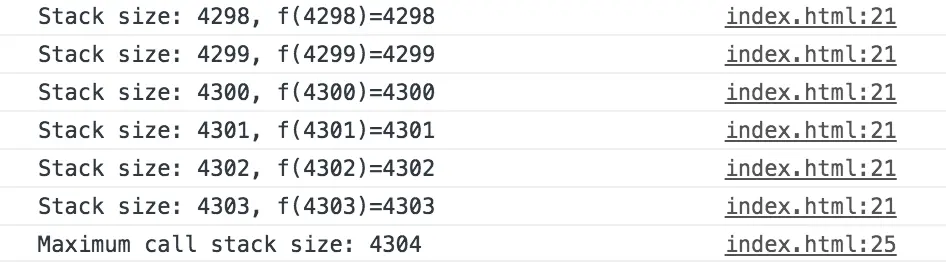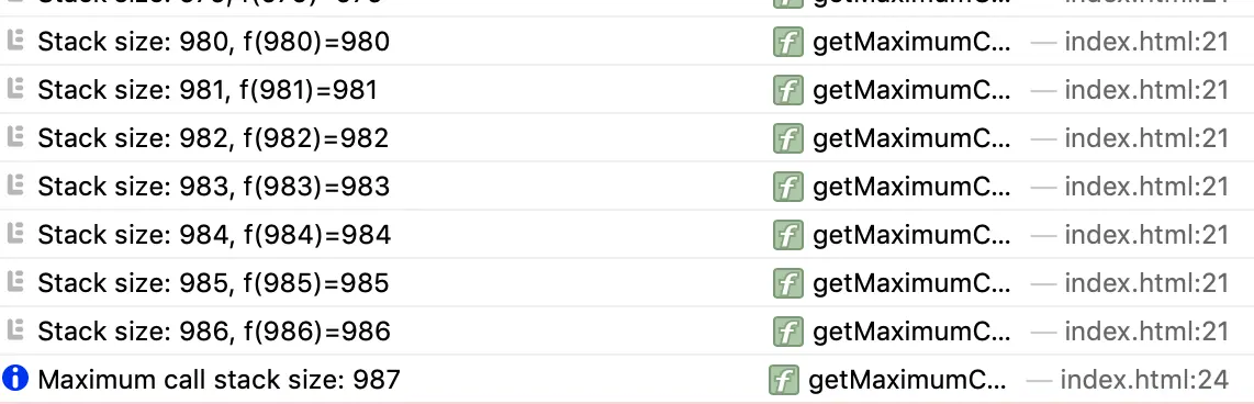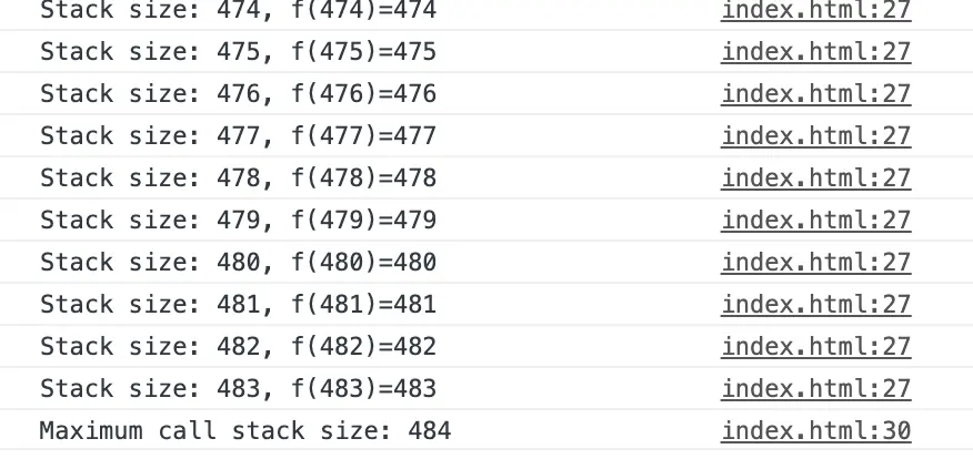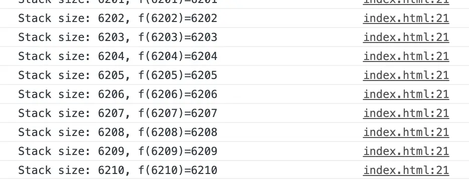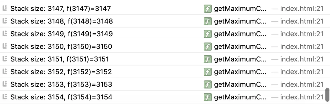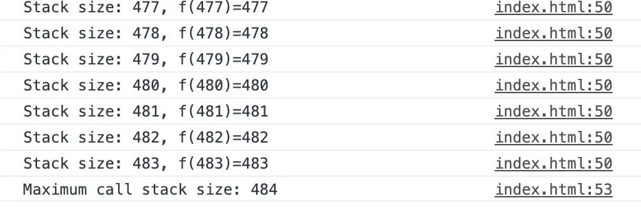 console.log(`Stack size: ${i}, f(${i})=${res}`);