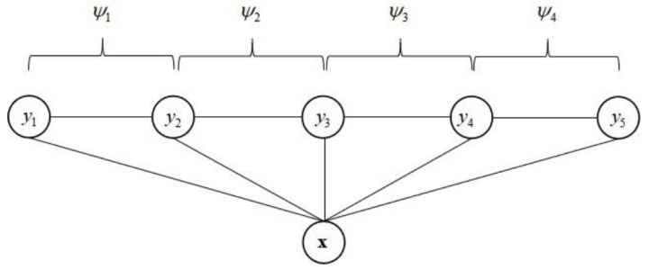 线性链条件随机场的因子分解为所有相邻两个状态变量,如下图所示