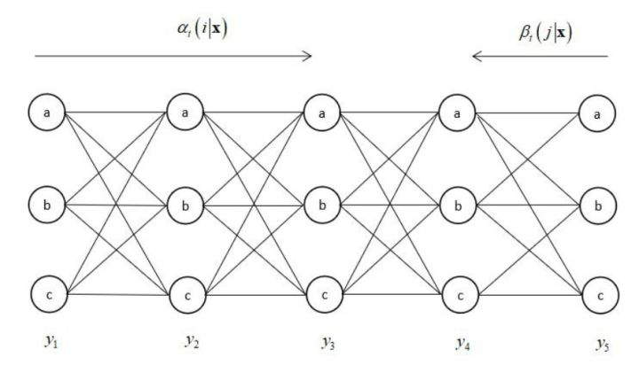 一般的条件随机场需要枚举所有的最大团,不易计算,下面介绍它的一种特殊情况,称为线性链条件随机场(linear chain conditional random field),由Lafferty等人在2001年提出[2]。线性链条件随机场中的状态变量形成一个线性链,类似于数据结构中的链表结构,每个节点只与前一个节点(如果存在),后一个节点(如果存在)有关。即在时间序列中每个变量只和前一时刻、后一个时刻的变量有关