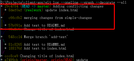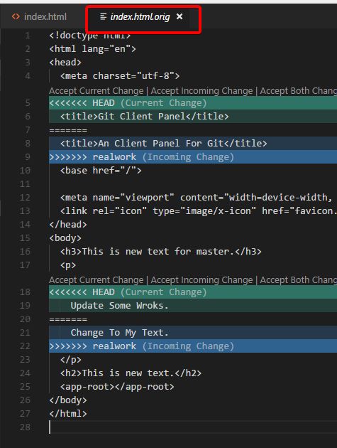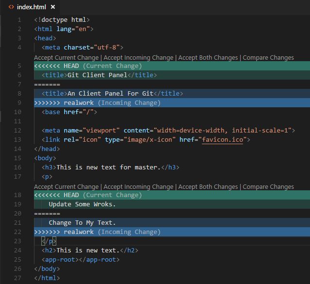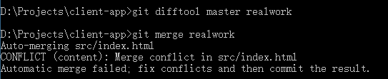可以看到两处冲突, 每处都有HEAD(master)版的和realwork分支版的.