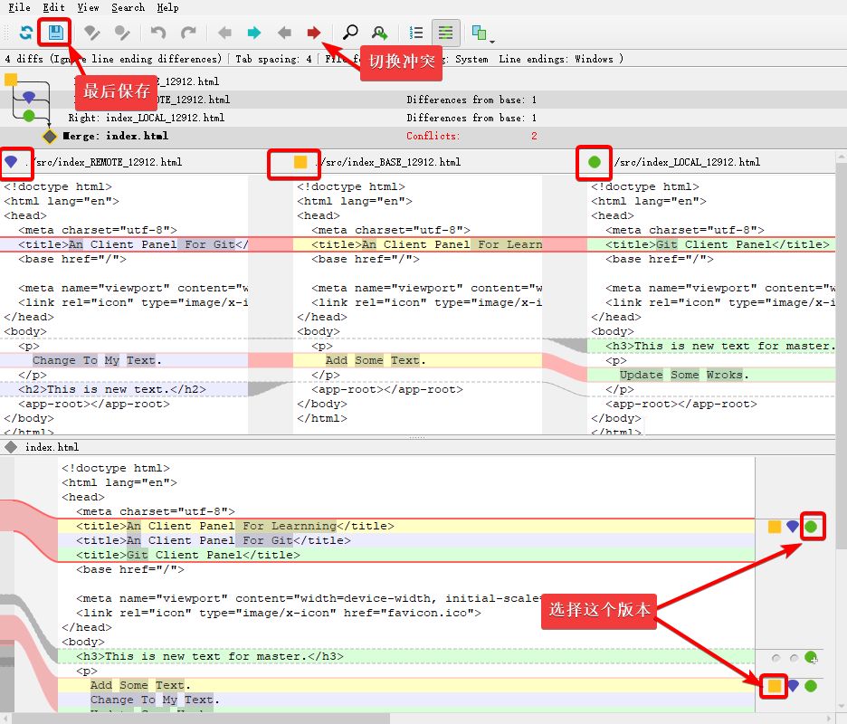 上图我使用的是Visual Studio Code, 可以点击上面的按钮来进行冲突的解决, 也可以手动修改文件进行解决.