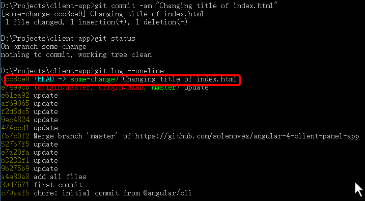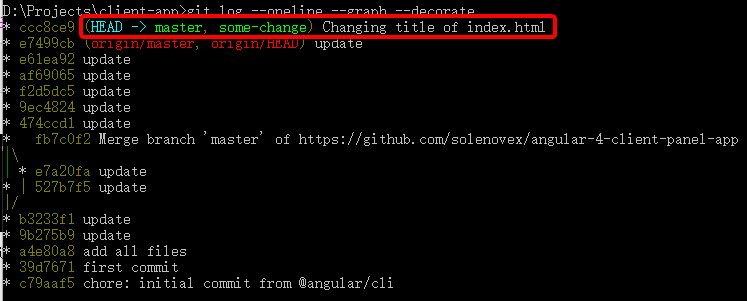 Commit之后查看历史纪录, 可以看到再some-change分支里, 修改了index.html的title.