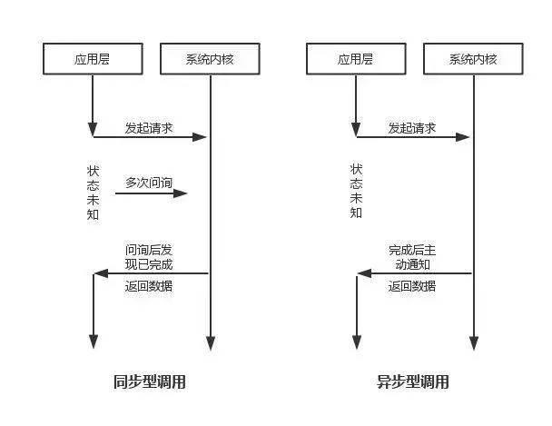 阻塞和非阻塞解决了应用层等待数据返回时的状态问题,那系统内核获取到的数据到底如何返回给应用层呢?这里不同类型的操作便体现的是同步和异步的区别。
