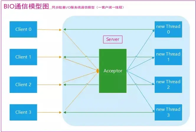 在传统的网络编程中,服务端监听端口,客户端请求服务端的ip跟监听的端口,跟服务端通信,必须三次握手建立。如果连接成功,通过套接字(socket)进行通信。 在BIO通信模型:采用BIO通信模型的服务端,通常由一个独立的Acceptor线程负责监听客户端的连接,它接收到客户端连接请求之后为每个客户端创建一个新的线程进行链路处理没处理完成后,通过输出流返回应答给客户端,线程销毁。即典型的一请求一应答通信模型。