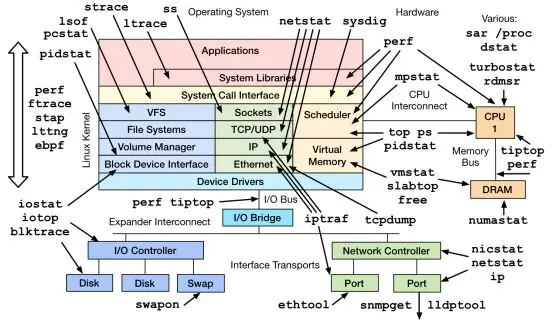 除了常用的 top、 ps、vmstat、iostat 等命令,还有其他 Linux 工具可以诊断系统问题,如 mpstat、tcpdump、netstat、pidstat、sar 等。