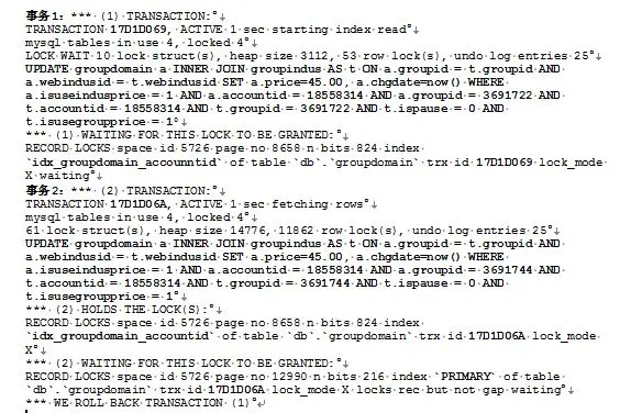 进一步分析可知事务 1 在请求事务 2 持有的`idx_groupdomain_accountid`二级索引加锁(加锁范围“space id 5726 page no 8658 n bits 824 index”),但是事务 2 已获得该二级索引 (“space id 5726 page no 8658 n bits 824 index”) 上所加的锁,在等待请求锁定主键索引 PRIMARY 索引上的锁。